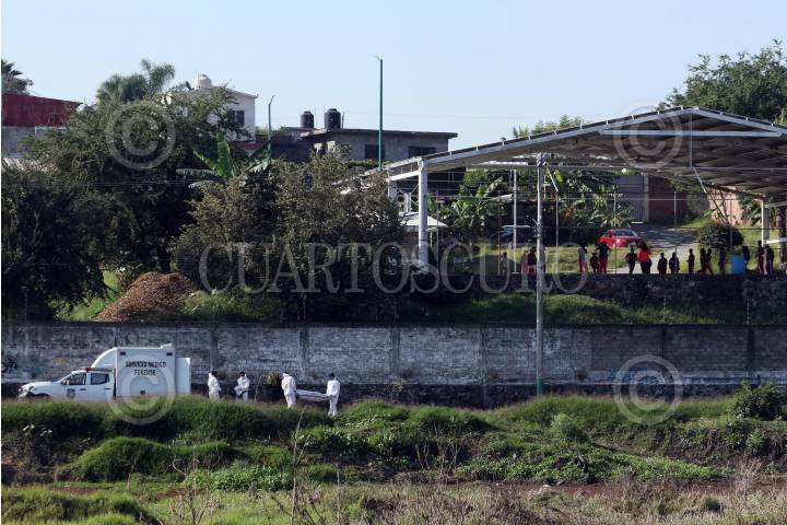 Personal del SEMEFO levantan un cadáver, arriba a la derecha alumnos de una secundaria hacen ejercicio en su clase de educación física.