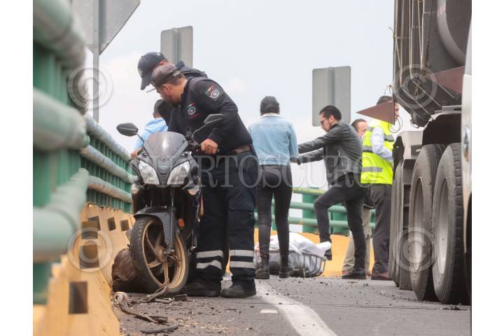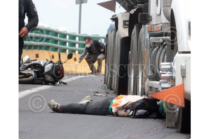 Un motociclista murió al trata de rebasar un tráiler de doble remolque, en el puente vehicular en avenida Mario Colín y Lerma, en la colonia San Javier.