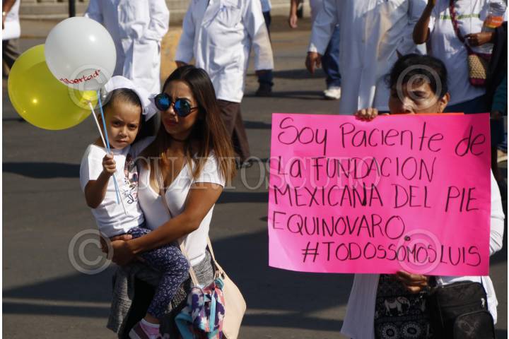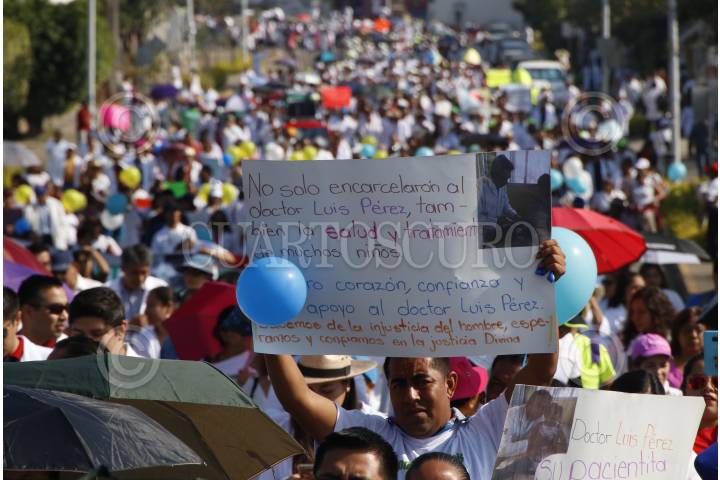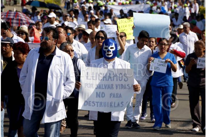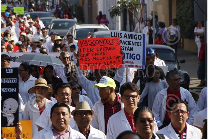 OAXACA, OAXACA, 08ABRIL2018.- Integrantes de la comunidad médica en Oaxaca marcharon en la ciudad de Oaxaca para demandar la liberación inmediata del traumatólogo con especialidad en Ortopedia Pediátrica, Luis Alberto P. M., detenido en días pasados por elementos de la Agencia Estatal de Investigaciones acusado del delito de homicidio doloso con agravante de responsabilidad médica, lo anterior por el fallecimiento de Edward Luna Trujillo de 3 años de edad a quien intervino quirúrgicamente el pasado 27 de noviembre por la fractura de su codo izquierdo. En la manifestación los médicos demandaron la reclasificación del delito y sea homicidio culposo y no doloso, pues señalan que ningún médico atiende a un paciente con la intensión de lesionar o matar, por lo que en las acciones de Luis Alberto no hubo dolo. FOTO: ARTURO PÉREZ ALFONSO/ CUARTOSCURO.COM