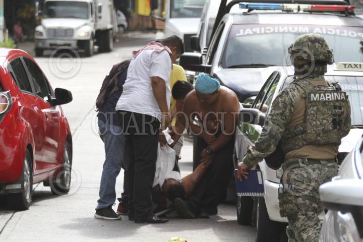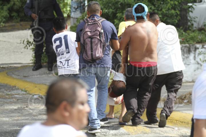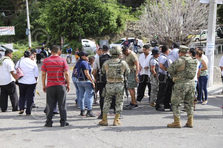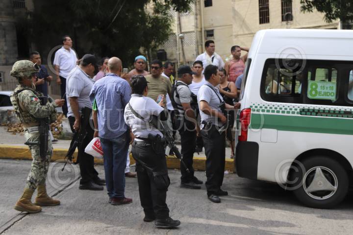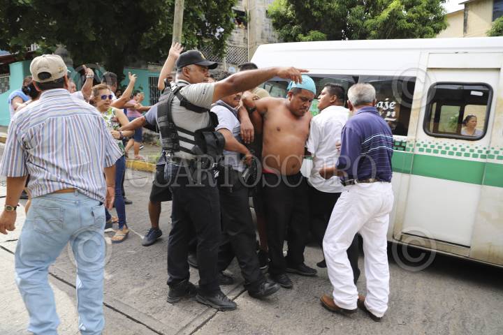 ACAPULCO, GUERRERO, 15JULIO2019.- El saldo de un enfrentamiento fue de un chófer muerto, los hechos ocurrieron en la terminal de transporte público de la colonia de Mozimba, al lugar arribaron Policías Ministeriales y elementos de Marina, quienes dieron fe de los hechos y acordonar el área, sin embargo, compañeros del occiso se llevaron su cuerpo lo que provocó que se armará una trifulca con los ministeriales quienes intentaron detenerlos, algunos policías apuntaron con sus armas largas a los hombres que reclamaban los restos. FOTO: BERNANDINO HERNÁNDEZ /CUARTOSCURO.COM
