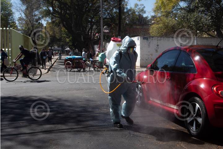 Trabajadores de limpieza desinfectaron calles y domicilios como parte de la brigada de sanitización en la colonia Barrio San Pedro, alcaldía Xochimilco con la finalidad de no seguir propagando el virus del SARSCOV-2