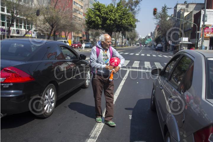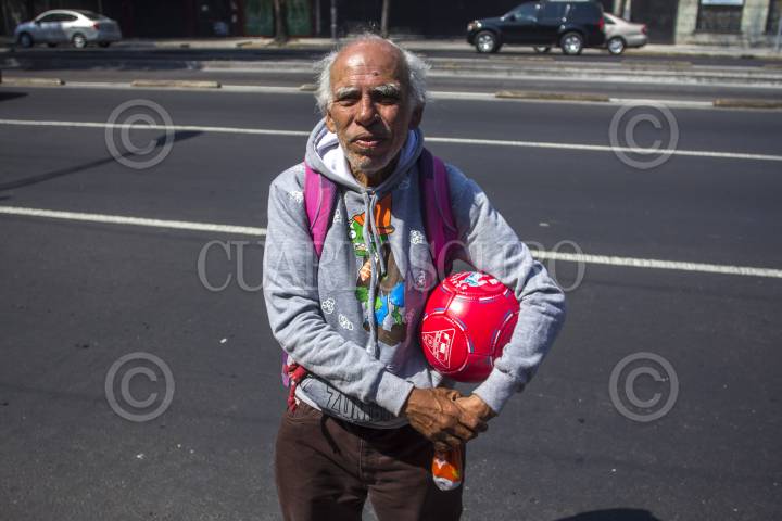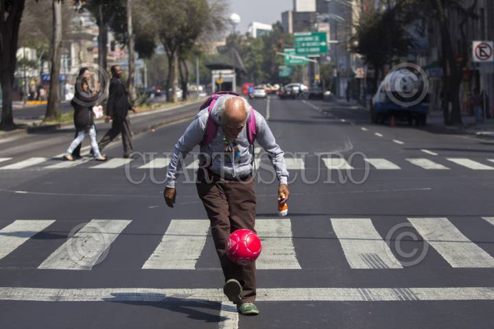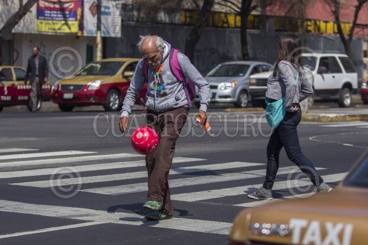 MÉXICO, D.F., 03FEBRERO2014.- Un señor de la tercera edad se gana unas monedas dominando un balón de futbol sobre la avenida Insurgentes a la altura de la calle Thomas Alba Edison en la colonia San Rafael para así poder pagar el hospedaje en su hotel en el barrio de la Merced donde lleva viviendo varios años. FOTO: ENRIQUE ORDÓÑEZ /CUARTOSCURO.COM