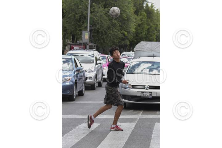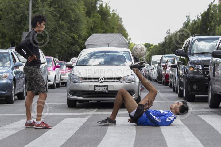 CIUDAD DE MÉXICO, 20JULIO2016.- Un par de jóvenes dominan un balón de fútbol, en el cruce de la avenida Reforma e Hidalgo. Tras un breve demostración, los chicos piden cooperación a los automovilistas que circulan por el lugar. FOTO: MOISÉS PABLO /CUARTOSCURO.COM