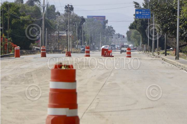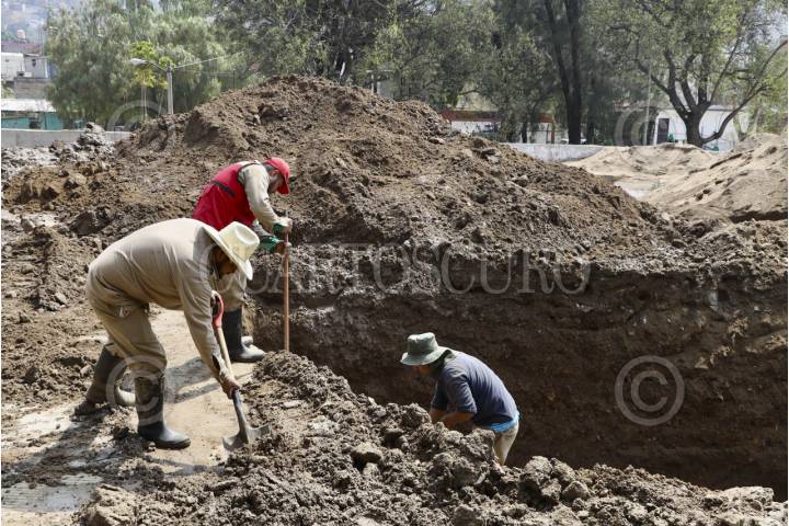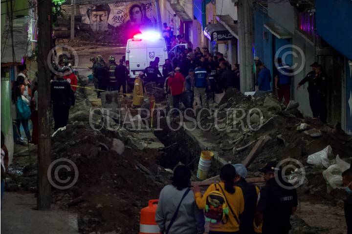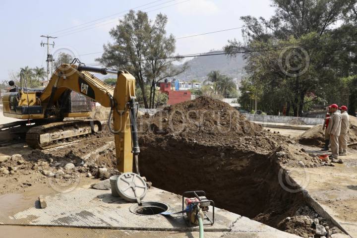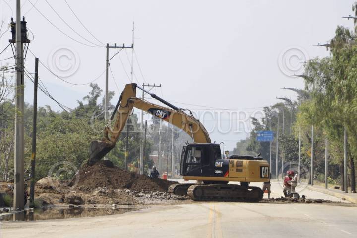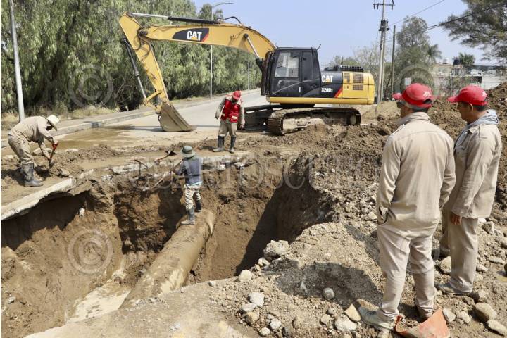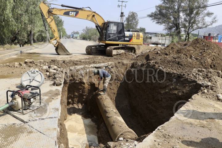 OAXACA DE JUÁREZ, OAXACA, 22ABRIL2025.- Debido a la lluvia registrada el pasado 20 de abril y una obra inconclusa de drenaje, se registró un socavón en las Riveras del Río Atoyac, una de las principales vías de acceso a la Central de Abasto de la capital de Oaxaca. Personal del Sistema Operador de los Servicios de Agua Potable y Alcantarillado de Oaxaca (Soapa) trabajan para reparar la red hidráulica que resultó afectada por el hundimiento de tierra, además se ha informado que dicha afectación provocará retrasos en el suministro de agua potable en las zonas sur, oriente y noreste de la zona metropolitana de Oaxaca. La vía fue cerrada a la circulación mientras concluyen los trabajos de reparación. FOTO: CAROLINA JIMÉNEZ/CUARTOSCURO.COM