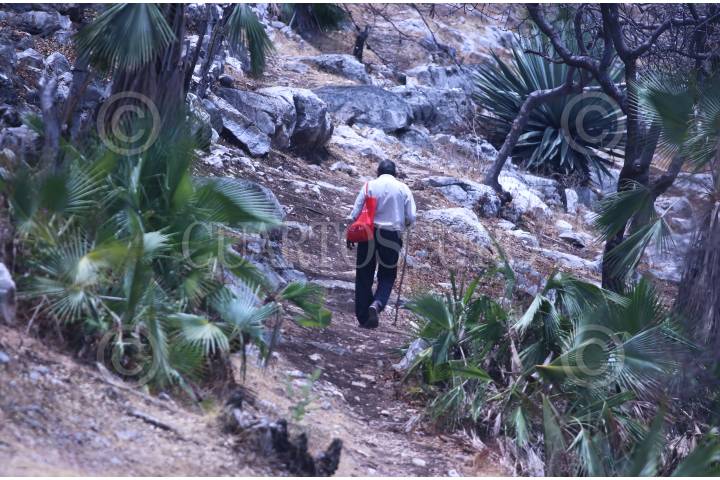 Un habitante de la colonia emergente El Mirador camina en una vereda abierta entre piedras y maleza.