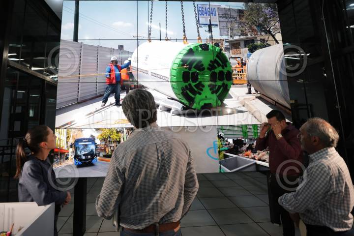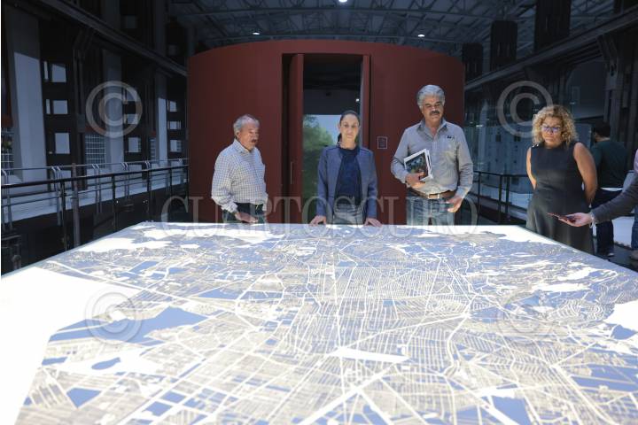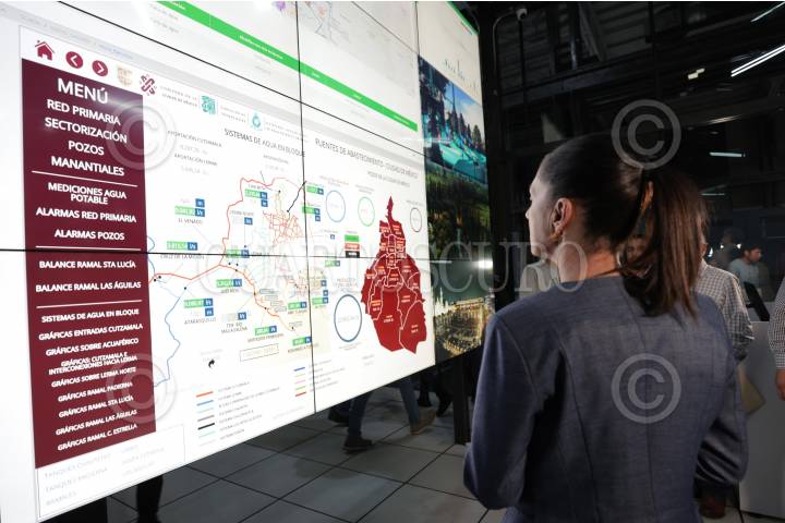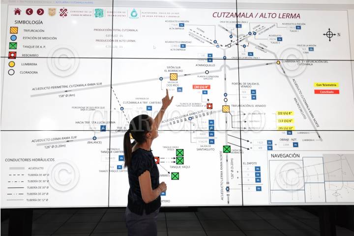 Claudia Sheinbaum durante el recorrido por la antigua planta de bombeo de Xotepingo, y la revisión de la plataforma única de la Red de Agua Potable y Drenaje del Sistema de Agua de la ciudad de México (SACMEX).