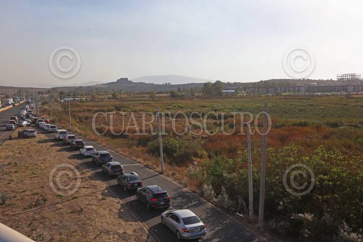 Filas de automóviles se observan en el centro de vacunación contra Covid-19 en Atizapán, Estado de México.