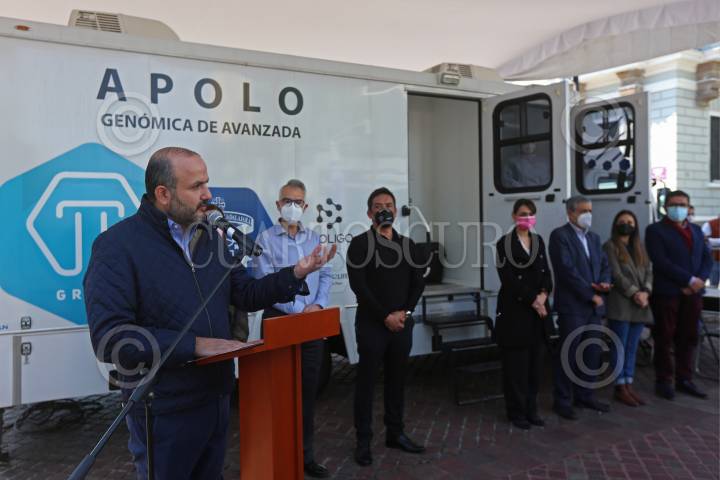 Ricardo Villanueva Lomelí, rector de la Universidad de Guadalajara, durante su discurso en la inauguración de la Unidad Móvil para Pruebas Covid “Apolo”.