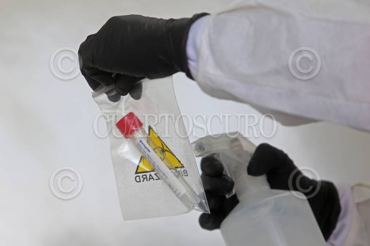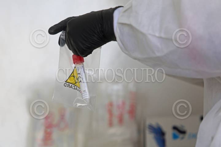 Una trabajadora de la salud, maneja los instrumentos utilizados después de realizar una prueba covid, esto durante la inauguración de la Unidad Móvil para Pruebas Covid “Apolo”.