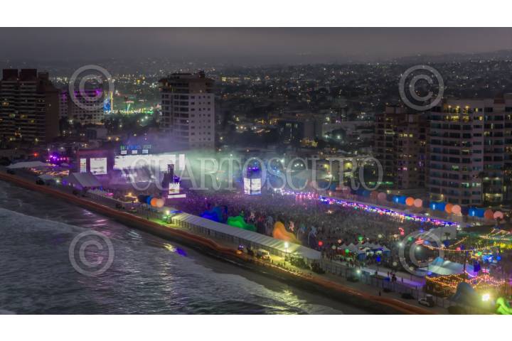 ROSARITO, BAJA CALIFORNIA, 09AGOSTO2025.- Vista panorámica del Baja Beach 2025, festival de musica urbana más importantes de América Latina, que atrajo a miles de visitantes nacionales y extranjeros en su séptima edición. Durante el sábado por la noche , las playas, calles y comercios lucieron abarrotados. Dentro del evento, en el recinto principal, el público disfrutó de artistas internacionales que hicieron vibrar el escenario, mientras que en las calles aledañas la fiesta continuó: turistas bailaban, brindaban y degustaban la gastronomía local. El Baja Beach Fest este sábado estuvo dominado por figuras clásicas del reguetón como Don Omar, Arcángel y Wisin; para este domingo el cartel principal lo integrarán Maluma, Mike Towers, entre otros. FOTO: OMAR MARTÍNEZ/ CUARTOSCURO.COM