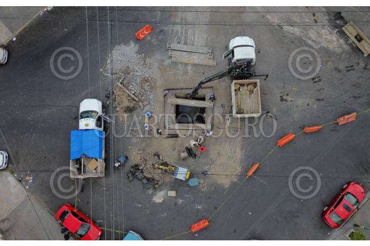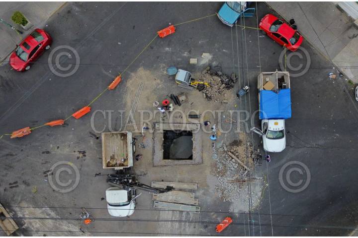 CIUDAD DE MÉXICO 20AGOSTO2025.- Imágenes aéreas de los los trabajos de reparación de un enorme socavón que se formó luego del paso de un camión de carga pesada en la calle Alfredo Chavero y su cruce con 5 de mayo en la Colonia Obrera de la alcaldía Cuauhtémoc. FOTO:ROGELIO MORALES /CUARTOSCURO.COM