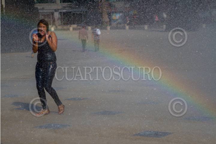MÉXICO, D.F., 05FEBRERO2015.- Una mujer en la fuente del Monumento a la Revolución se divierte dándose una ducha. FOTO: IVÁN STEPHENS /CUARTOSCURO.COM