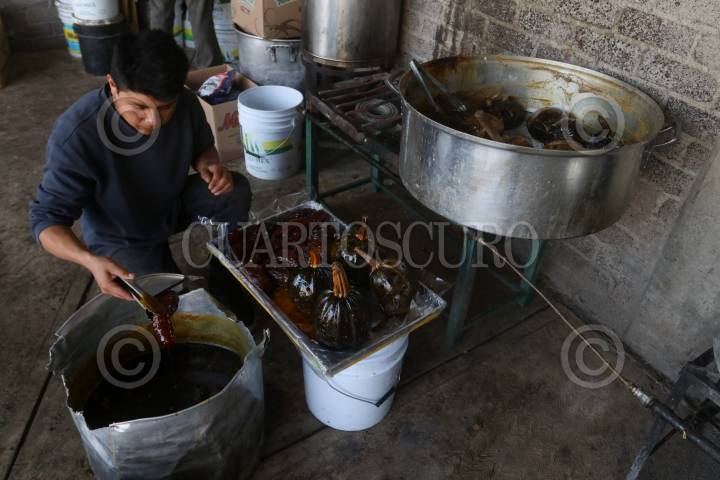 Un trabajador revisa las calabazas con miel para su proceso de dulce cristalizado, en Santa Cruz Alcapixca