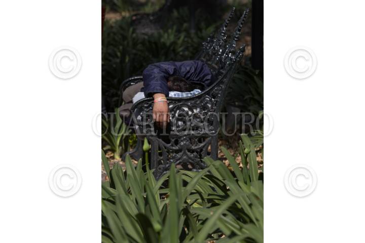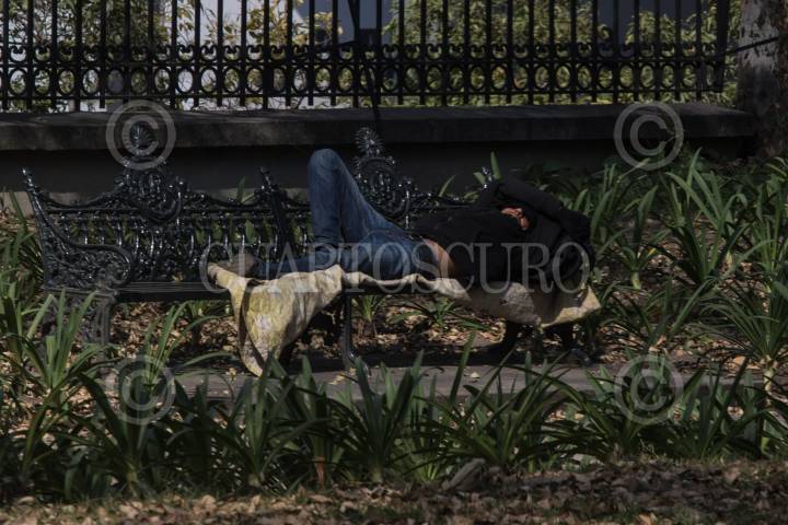 Aún con frío de esta mañana en la ciudad de México, un ciudadano duerme en una de las bancas del parque de República Brazil en la colonia centro. FOTO: Eunice Adorno/CUARTOSCURO.COM