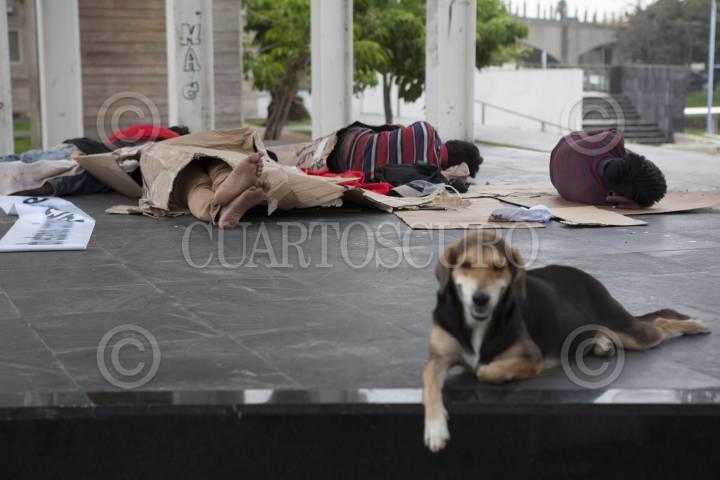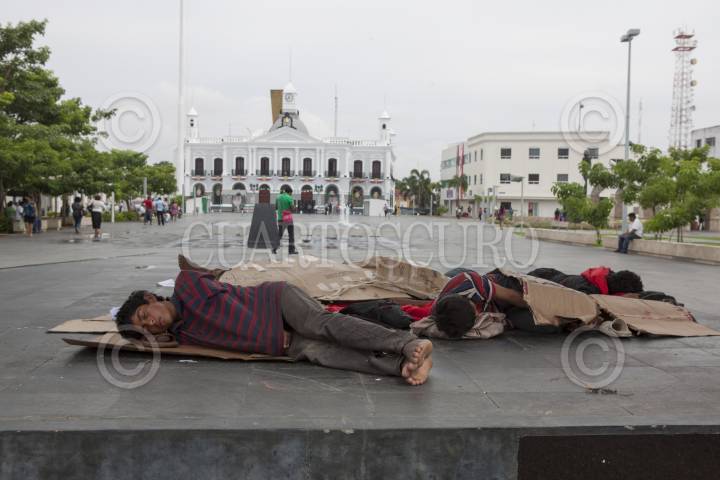 VILLAHERMOSA, TABASCO, 10SEPTIEMBRE2014.- Un grupo de jóvenes posiblemente no mayores a los 22 años de edad tomaron la plancha de un estrado en la Plaza de Armas como su dormitorio particular. Son cinco los muchachos que con cartones y sus propios cuerpos se dan cubren para dormir y amanecer en este espacio público a unos cuantos metros de Palacio de Gobierno, y quienes dicen que al no tener casa o familiar a donde llegar, tienen como su morada en el parque público mencionado. FOTO: MARCO POLO GUZMÁN HERNÁNDEZ /CUARTOSCURO.COM