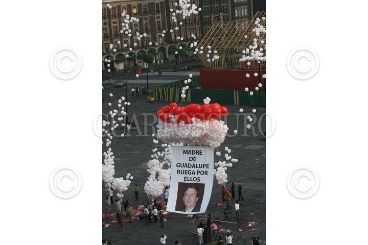 MÉXICO, D.F., 09MAYO2008.- Integrantes de pro-vida encabezados por Jorge Serrano Limon colocaron cientos de globos en la plancha del Zócalo de la ciudad y una manta con la imágen del jefe de Gobierno al mismo que rezaban y pedian por los legisladores que aprobaron la ley pro-aborto. FOTO: SÁSHENKA GUTIÉRREZ/CUARTOSCURO.COM