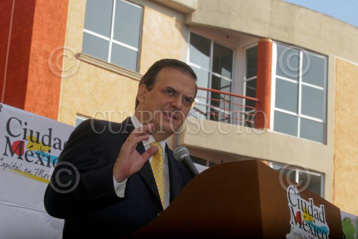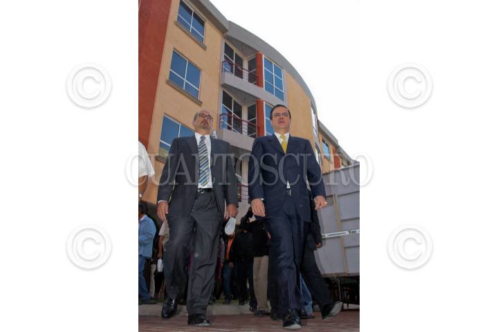 MÉXICO, D.F., 24JULIO2009.- José Antonio Revah director general del INVI y Marcelo Ebrard jefe de gobierno del Distrito Federal, durante la entrega 94 casas sustentables en Tláhuac, las cuales cuentan con mecanismos sustentables como calentadores solares y de gas; plantas de tratamiento de aguas jabonosas para sanitarios y sistema ahorrador de agua en regaderas FOTO: RICARDO CASTELAN/CUARTOSCURO.COM