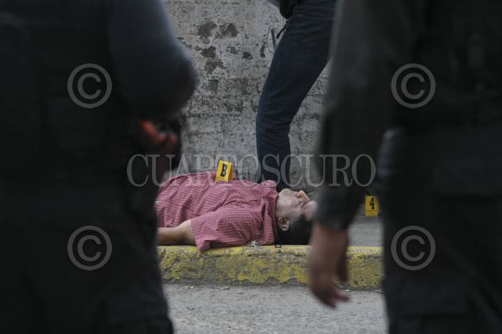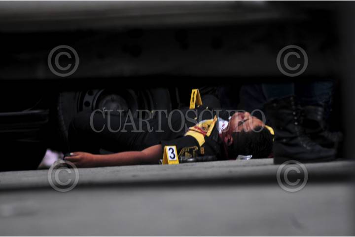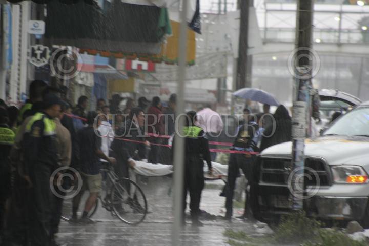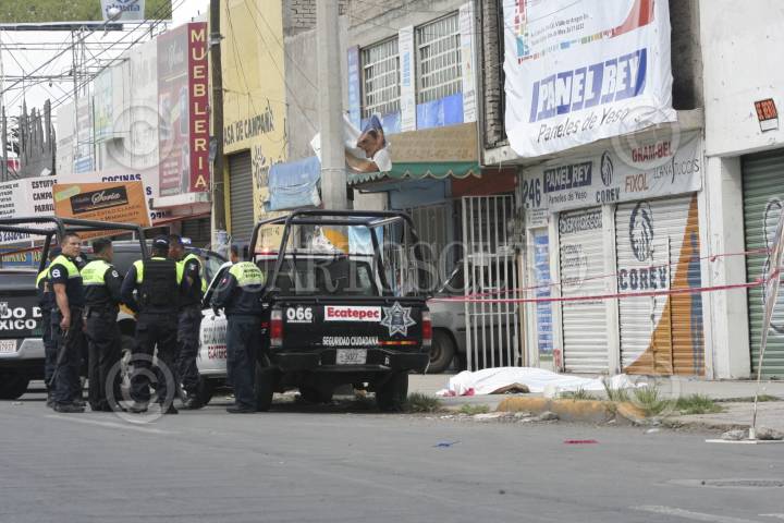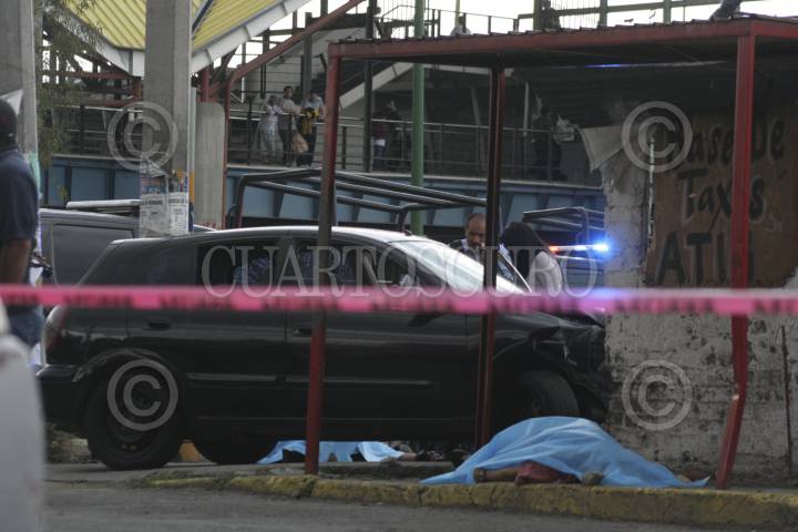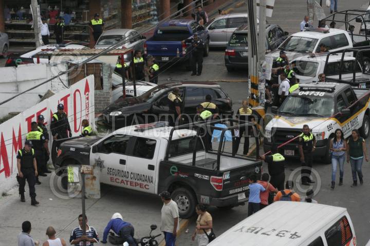 ECATEPEC, EDOMEX, 23AGOSTO2014.- Un automovilista, un policía y un ladrón murieron en un intento de asalto, en calles de la Colonia Arboledas de Aragón, de este municipio. Datos preliminares de las autoridades detallan que un sujeto de aproximadamente 40 años que circulaba sobre la Avenida Central, a la altura de la calle Valle del Don, a bordo de un vehículo Almera, placas 219-SLZ, fue interceptado para ser víctima de un atraco. El hombre de quien se desconoce identidad, se negó a entregar el vehículo, por lo que fue baleado de muerte, al ser perseguido por un policía estatal choca el vehículo en la esquina de valle de Guadiana y avenida Central, el oficial y el supuesto delincuente intercambiaron balazos, muriendo ambos. FOTO: LUIS CARBAYO /CUARTOSCURO.COM