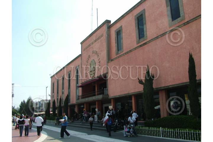 ECATEPEC, ESTADO DE MEXICO., 07NOVIEMBRE2008 .- Ecatepec de Morelos, es el nombre oficial de este municipio. "Ecatepec", que en náhuatl “Ehecatl”, quiere decir “En el cerro del Viento” de Morelos en honor a José María Morelos, héroe de la guerra de independencia quien murió fusilado en la cabecera municipal, San Cristobal , el municipio de Ecatepec se localiza l noreste de la Ciudad de México, colindando con la Delegación Gustavo A. Madero, colinda al norte con los municipios de Coacalco de Berriozábal, Tecamac y Tultitlán; al sur con los municipios Nezahualcóyotl y Texcoco; al este con Acolman y Atenco; al oeste con Tlalnepantla y con la delegación Gustavo A. Madero. Pertenece también al área metropolitana de la Ciudad de México. Originalmente Ecatepec era una zona rural, que pasó a ser industrial y después a ser un lugar habitacional e industrial. En la imagen aparece el palacio municipal de Ecatepec. FOTO: MARIO NULO/CUARTOSCURO.COM