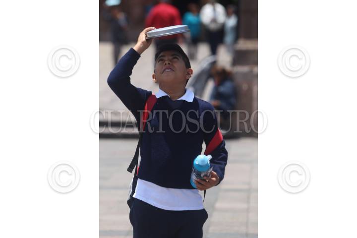 MORELIA, MICHOACÁN. 21AGOSTO2017.- Alrededor de las 12:00 horas de este lunes en la Plaza Melchor Ocampo de Morelia se pudo observar el eclipse solar a través de los telescopios que instaló y filtros que prestó la Sociedad Astronómica de Michoacán. FOTO: JUAN JOSÉ ESTRADA SERAFÍN /CUARTOSCURO.COM
