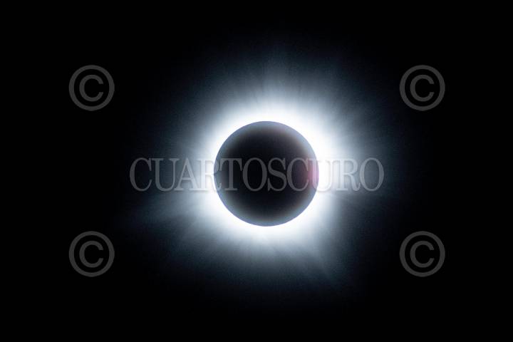 CONCORDIA, SINALOA, 08ABRIL2024.- Momento en el que la luna tapa totalmente la circunferencia del sol durante el eclipse que se pudo observar en todo México, solo en ciertas partes del norte del país el fenómeno se pudo observar de esta forma. FOTO: LUIS GUTIÉRREZ/CUARTOSCURO.COM