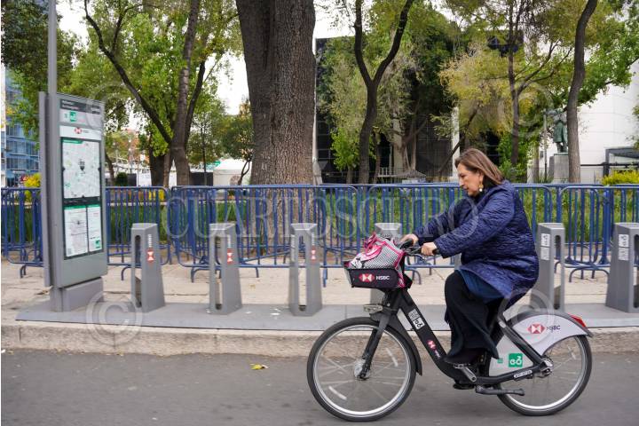 CIUDAD DE MÉXICO, 14NOVIEMBRE2023.- Xóchitl Gálvez, precandidata a la Presidencia por el Frente Amplio por México, arriba en en una Ecobici (sistema de bicicletas públicas de la Ciudad de México) al Senado de la República. FOTO: CUARTOSCURO.COM