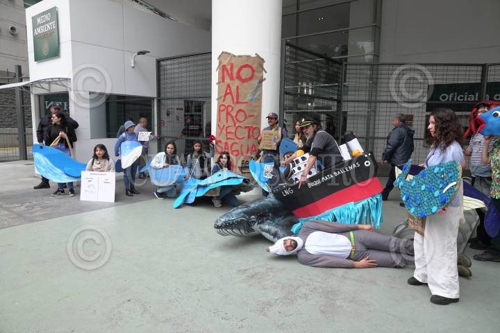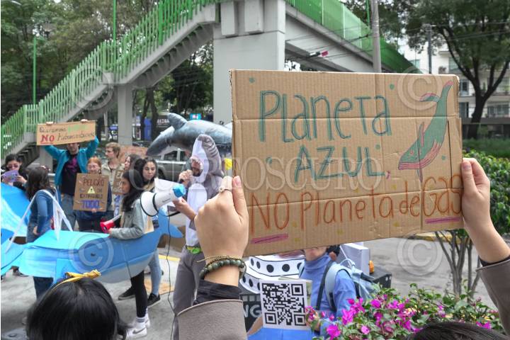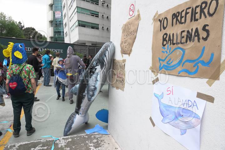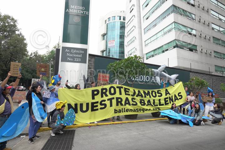 CIUDAD DE MÉXICO, 08OCTUBRE2024.- Activistas que se oponen al megaproyecto "Saguaro Energía", el cual pretende gas natural construir una gasoducto que afectaría el Golfo de California (considerado el Acuario del Mundo), se manifestaron afuera de la Semarnat para exigirla a la nueva secretaría Alicia Bárcena a que se reconsidere el este proyecto, ya que ellos afirman que pone en peligro a especies como las ballenas. Actualmente este megaproyecto gasífero cuenta con el aval de la CFE. Los inconforme exigieron a la sociedad civil sumarse la campaña ¿Ballena o Gas?, que busca la cancelación de esta obra. FOTO: MOISÉS PABLO/CUARTOSCURO.COM