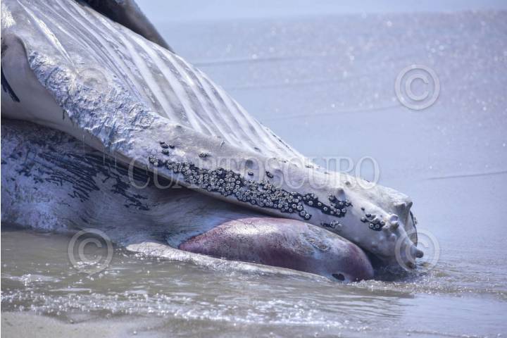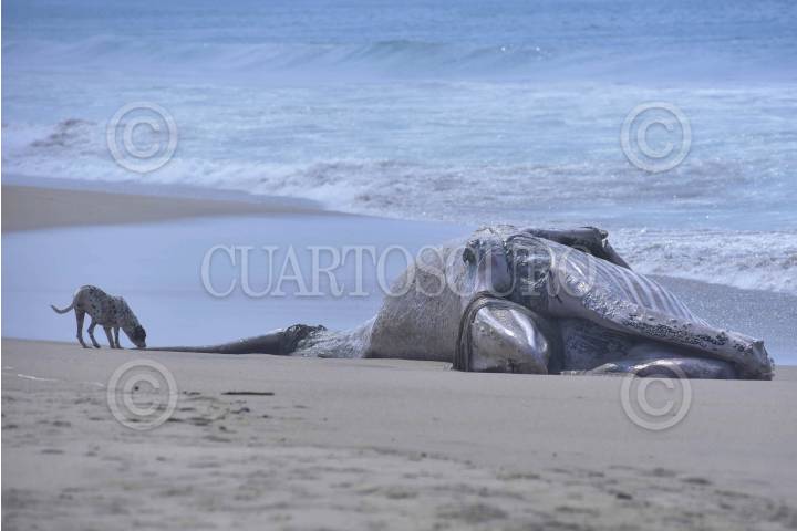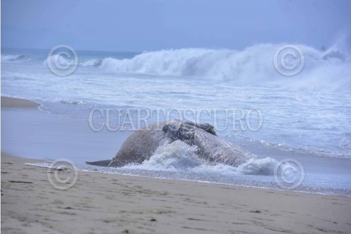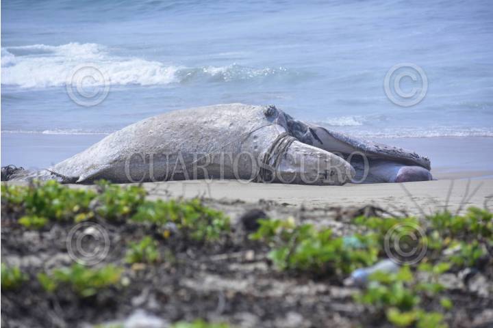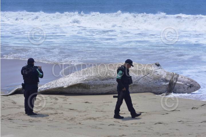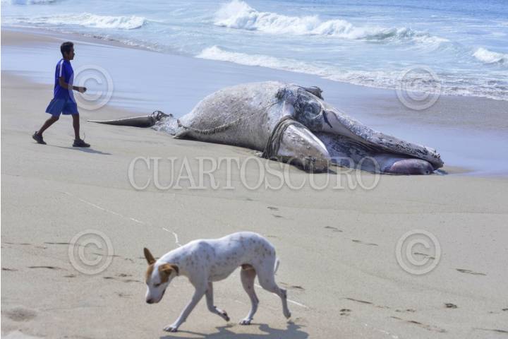 ACAPULCO, GUERRERO, 23ABRIL2025.- Una ballena jorobada que aprecio ayer muerta en la playa de La Barra de Coyuca, continúan en el lugar, un prestador de servicios turísticos del lugar mostró las cuerdas de un red de trasmallo con las que ballena se enredó y causó su probable muerte, vecinos piden que las autoridades retiren los restos del cetáceo que ya empezó a despedir malos olores por su estado de descomposición. FOTO: CARLOS ALBERTO CARBAJAL/CUARTOSCURO.COM