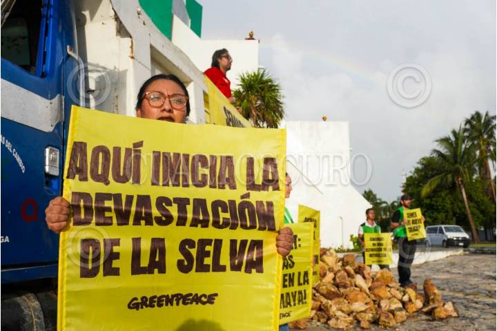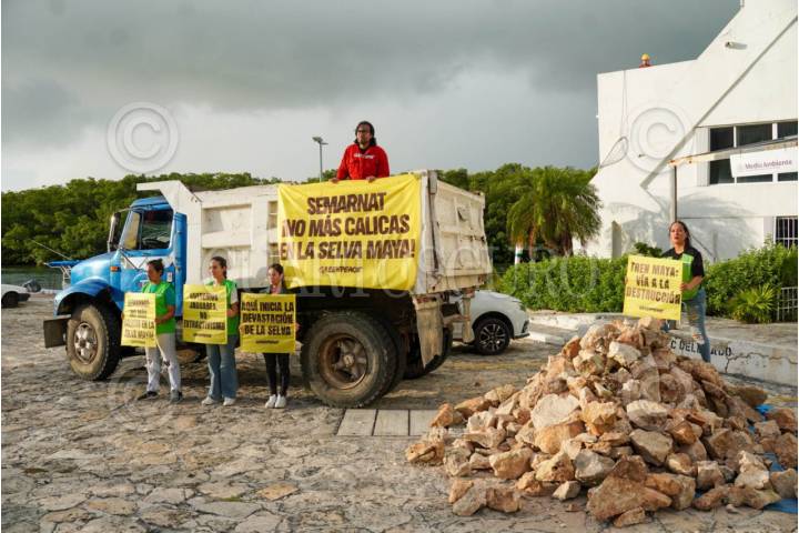 CANCÚN, QUINTANA ROO, 07JULIO2025.- Activistas de Greenpeace volcaron material pétreo este lunes frente a las oficinas de SEMARNAT, ubicado en la Zona Hotelera de Cancún, en protesta por las autorizaciones que esa dependencia ha otorgado para la extracción de material pétreo en la selva maya, conocido como "sascaberas". Esta acción se une a la campaña "México al grito de Selva". FOTO: ELIZABETH RUIZ/CUARTOSCURO.COM