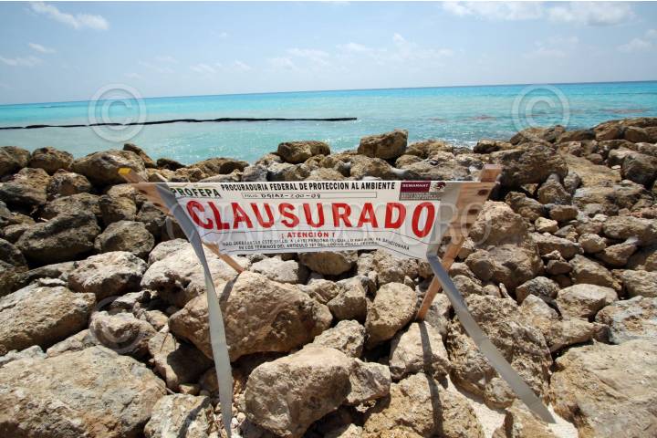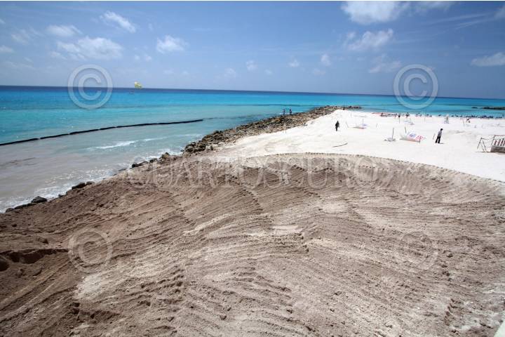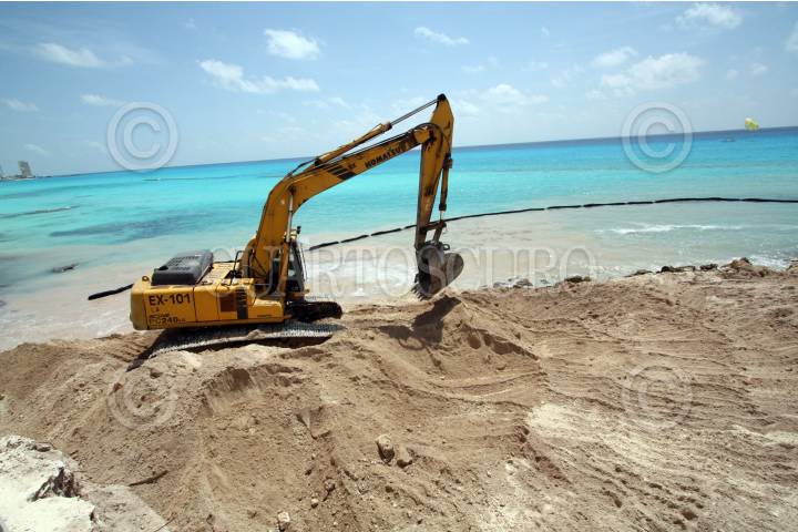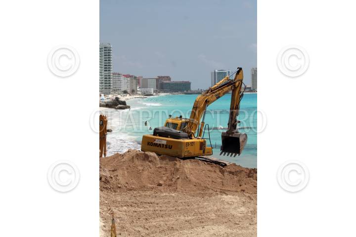 CANCÚN, QUINTANA ROO, 13AGOSTO2009.- Inicio el retiro del espigón del hotel Gran Caribe Real, situación que causó un enfrentamiento entre el sector hotelero del estado y la Procuraduría Federal del Medio Ambiente y tras una serie de acuerdos, empresarios del hotel Hyat que se encuentra a un costado accedieron a abrir un espacio para la salida de toneladas de piedra y residuos petreos que el hotelero había acumulado frente a su propiedad. El gobierno estatal actuó como intermediario ante la clausura de la playa del hotel Gran Caribe Real hace dos semanas, cuando la Profepa colocó mantas y enrrejado sobre las zonas de litoral de este hotel por violar normas ecológicas federales. FOTO: AMARANTA PRIETO/CUARTOSCURO.COM