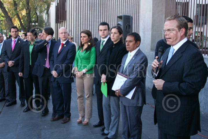 MÉXICO, D.F., 03DICIEMBRE2009.- Los senadores del Partido Verde, Arturo Escobar y Jorge Legorreta Ordorica, conversan durante el acto en el que sus legisladores presentaron una carta dirigida a el Presidente de México, en la que exige una postura firme de liderazgo en la Cumbre de Copenhague y el impulso para que el país invierta en las energías renovables, así como metas claras para disminuir la deforestación. Se le dio lectura al texto afuera de la Secretaría de Relaciones Exteriores el cual se entregó en dicha institución. FOTO: MOISÉS PABLO/CUARTOSCURO.COM