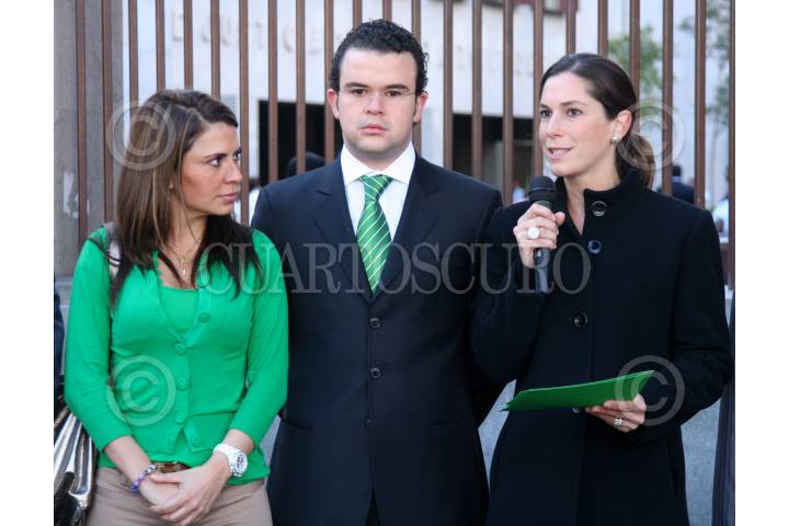 MÉXICO, D.F., 03DICIEMBRE2009.- Los diputados federales Adriana Sarur Torre y Diego Guerrero Rubio, observan a Mariana Boy Tamborrel, Secretaría de Ecología y Medio Ambiente del PVEM, durante la entrega de un documento destinado a el Presidente de México, en la que le exigen adoptar una postura firme en la cumbre de Copenhague y el impulso de las energías renovables, así como metas claras en la políticas de la deforestación, esto en un mitin afuera de la sede de la Secretaría de Relaciones Exteriores. FOTO: MOISÉS PABLO/CUARTOSCURO.COM