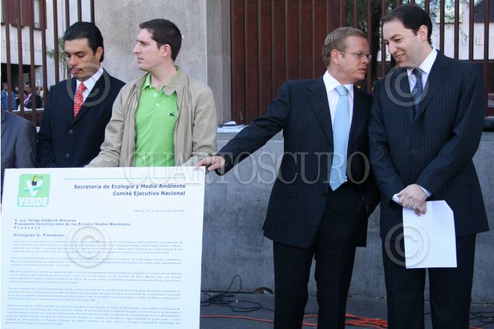 MÉXICO, D.F., 03DICIEMBRE2009.- Diputados federales y senadores del Partido Verde Ecologistas de México, entregaron una carta dirigida a el Presidente de México, en la que le exigen una postura firme de liderazgo en la Cumbre de Copenhague y el impulso para que el país invierta en las energías renovables, así como metas claras para disminuir la deforestación. El acto fue encabezado por Mariana Boy Tamborrel y Arturo Escobar, su coordinador parlamentario, afuera de la Secretaria de Relaciones Exteriores. FOTO: MOISÉS PABLO/CUARTOSCURO.COM