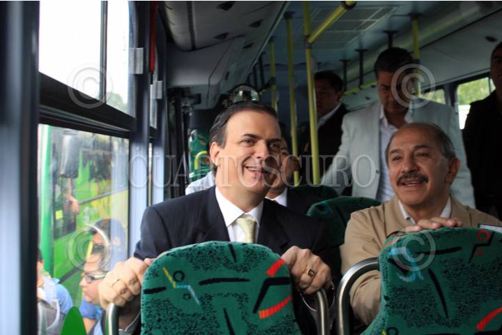 MÉXICO, D.F., 02AGOSTO2009.- Marcelo Ebrard Casaubón, Jefe de Gobierno y Armando Quintero, Secretario de Transporte y Vialidad, dieron el banderazo de salida a los nuevos autobuses que correrán por Avenida Reforma. FOTO: CUARTOSCURO.COM