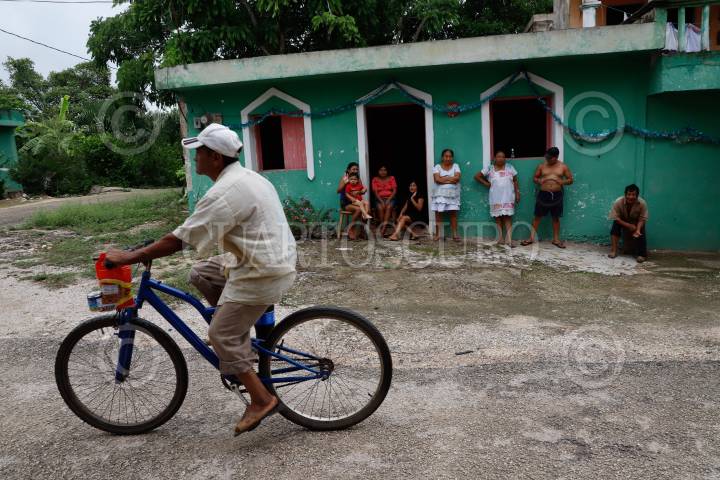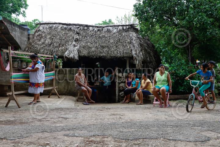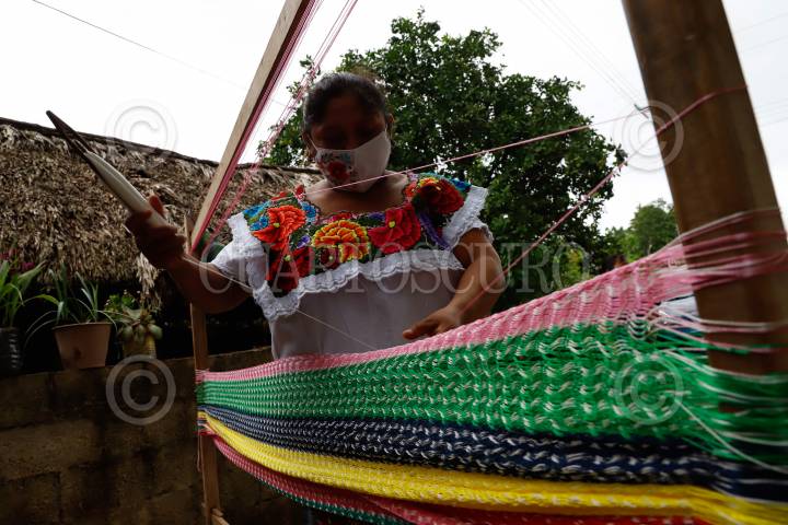 Un mujer realiza un tejido en la comunidad de Ek Balam, en esta comunidad se realizó la firma entre el Fonatur, INAES y APTC, para impulsar el turismo comunitario y economía social en la ruta del Tren Maya.