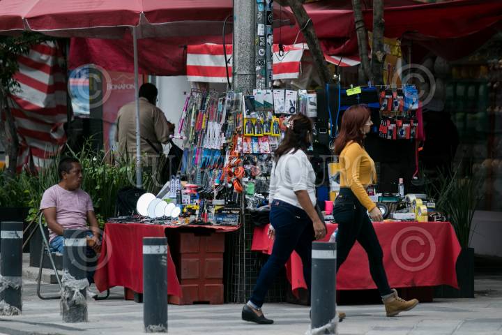 Un vendedor de cargadores, extensiones eléctricas, espejos y artículos varios observa el paso de los transeúntes sobre Avenida Insurgentes.