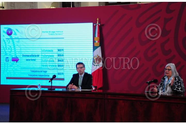 Luis Antonio Ramírez, titular del ISSSTE, y Graciela Márquez, secretaria de Economía, durante la conferencia sobre Créditos a la Palabra.