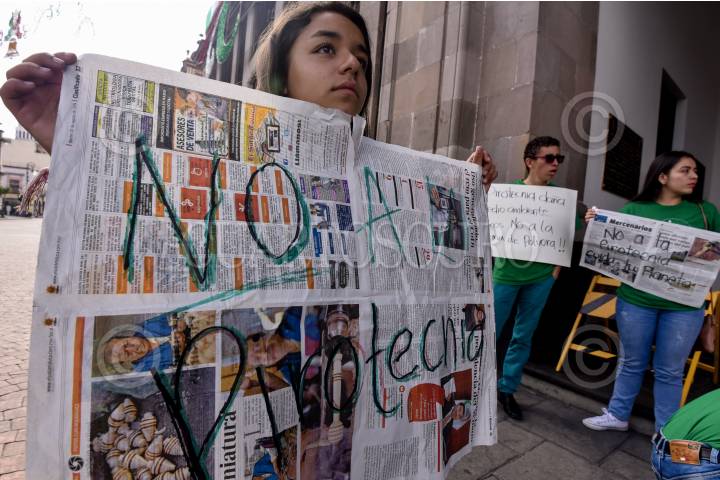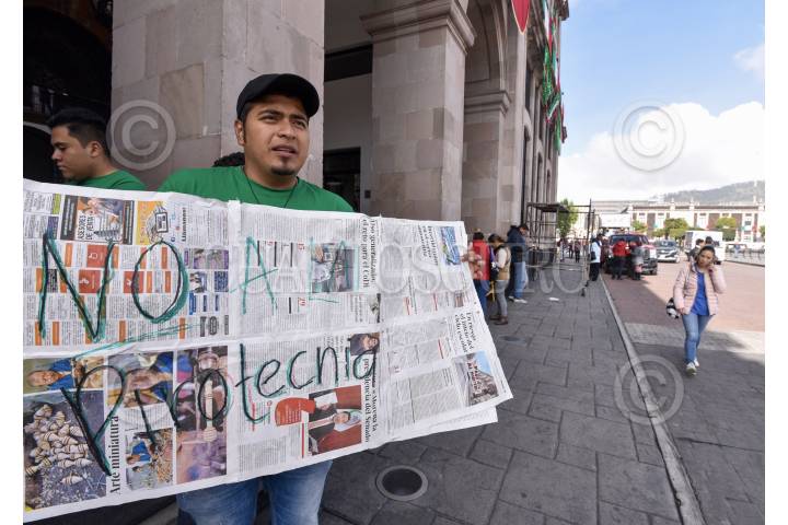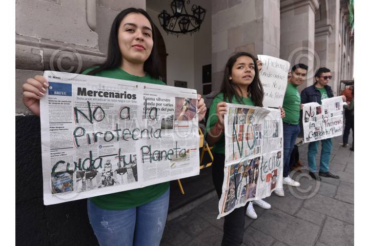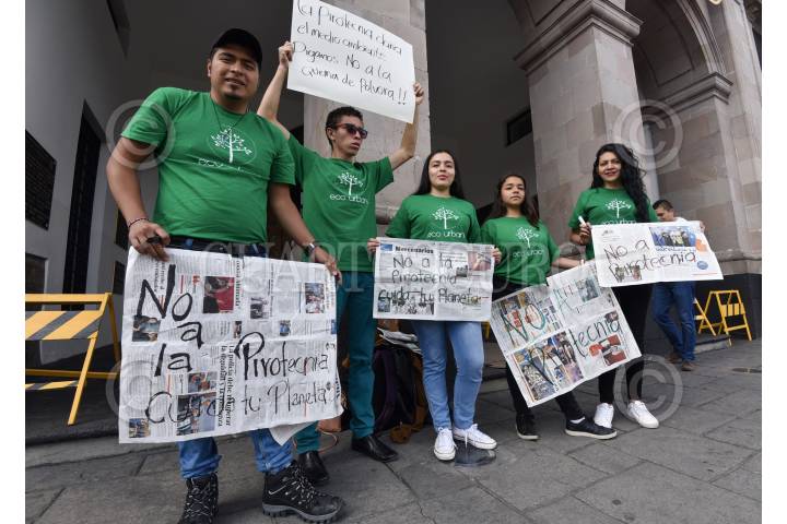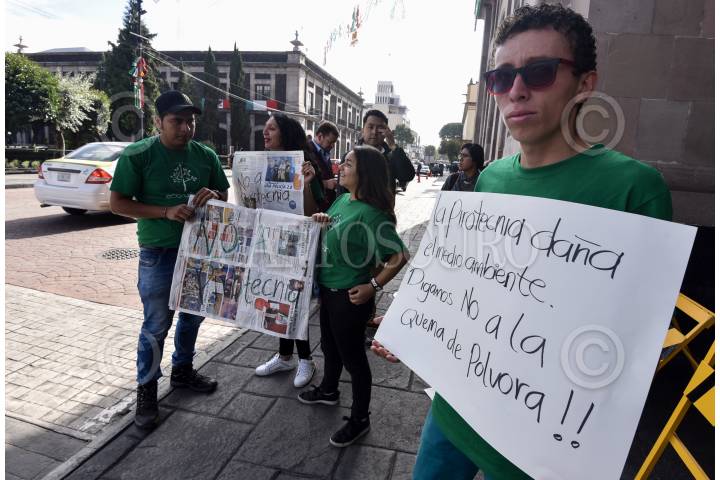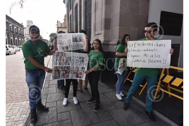TOLUCA, ESTADO DE MÉXICO, 13SEPTIEMBRE2019.- Integrantes de la organización civil Eco Urban se manifestaron frente a la presidencia municipal de Toluca para pedir se evite el uso de pirotecnia en la celebración de las Fiestas Patrias, ya que esto puede generar mala calidad del aire en los siguientes días; en el Estado de México solo un municipio prohibió la venta de pirotecnia. FOTO: CRISANTA ESPINOSA AGUILAR /CUARTOSCURO.COM