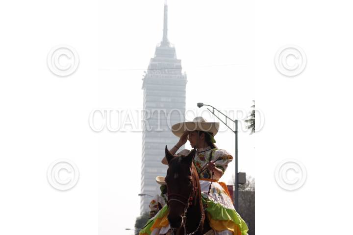 MÉXICO, D.F., 21NOVIEMBRE2009.- El desfile conmemorativo del 99 Aniversario de la Revolución Mexicana, comenzó en explanada del Zócalo y terminó en la Puerta de los Leones del Bosque de Chapultepec, con la participación de jinetes de la Secretaría de la Defensa Nacional, la Asociación Mexicana de Charrería, agrupamientos a caballo y carros alegoricos. FOTO: ESSENE HERNÁNDEZ/CUARTOSCURO.COM