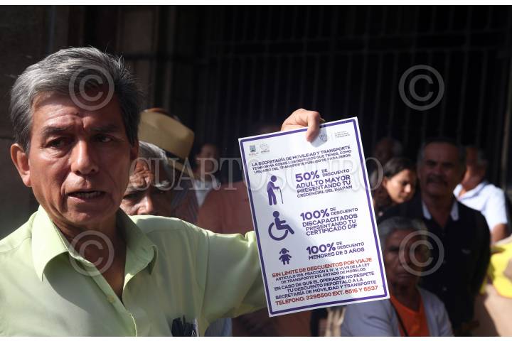 CUERNAVACA, MORELOS, 02OCTUBRE2019.- Gabriel Rivas, vocero de la Asociación Cívica Morelense muestra un cartel que debe estar colocado en las unidades del servicio público de transporte, donde se informa de los descuentos a personas de la tercera edad, servicio gratuito a niños menores de 3 años de edad y personas con discapacidad. El vocero denuncio que choferes no respetan esta normativa, por lo que urgen a la Secretaria de Movilidad de Morelos atienda este problema. FOTO: MARGARITO PÉREZ RETANA /CUARTOSCURO.COM