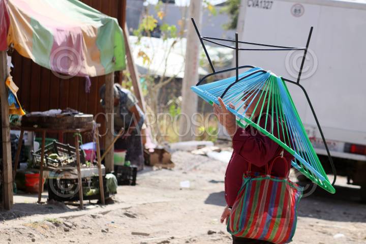 Un hombre de la tercera edad recorre la calle Universo de la colonia Universo trasladando una silla Acapulco sobre su cabeza.