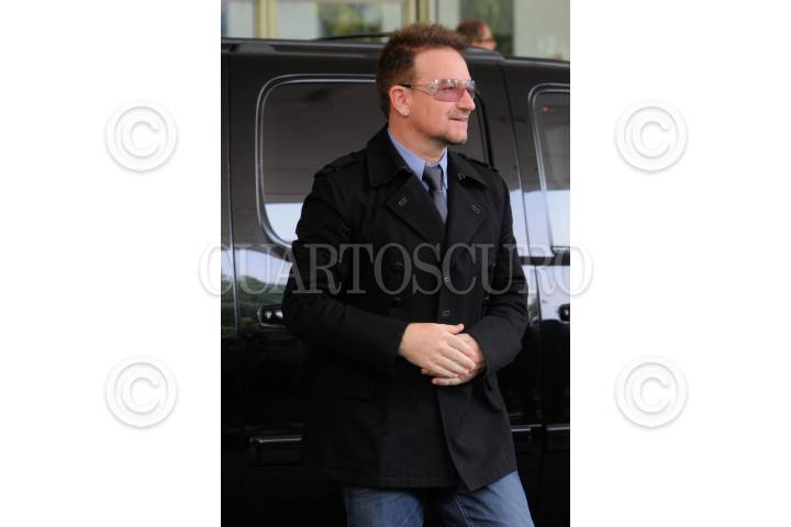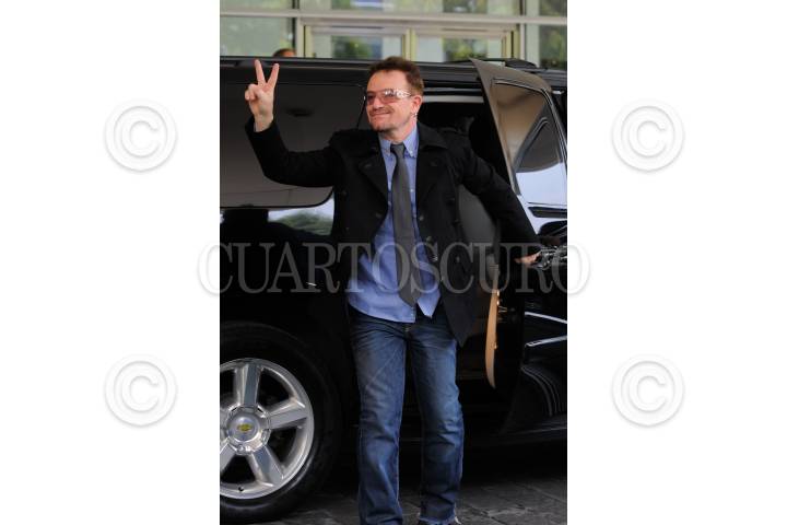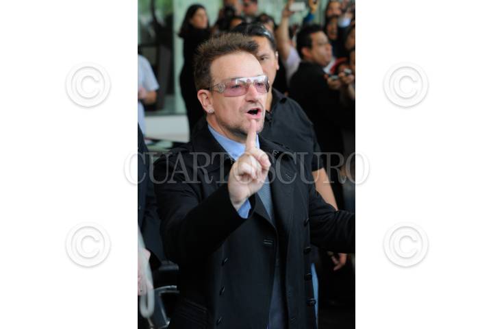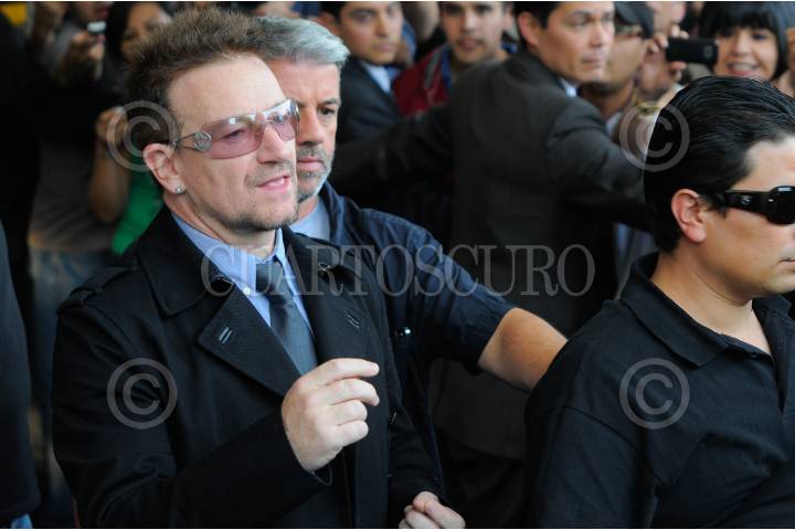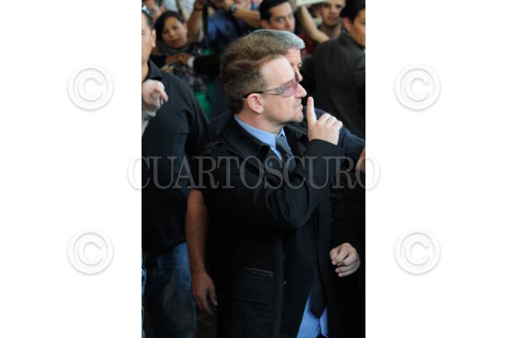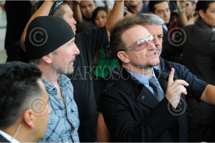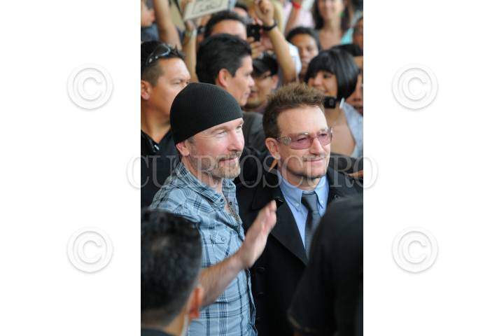 MÉXICO, D.F., 10MAYO2011.- Bono, líder de la banda de rock, U2 y The Edge, guitarrista, salieron por unos instantes a saludar a decenas de fans que se encontraban montando guardia a las afueras de conocido hotel en Paseo de la Reforma en la Ciudad de México. FOTO: FRANCISCO RODRIGUEZ/CUARTOSCURO.COM