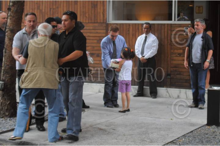 MÉXICO, D.F., 10MAYO2011.- Edge, guitarrista de la banda irlandesa U2, sale del restaurante Pujol en la zona de Polanco donde recibió un pastel por parte de sus fans. U2 se presenta el los próximos días en el Estadio como parte de su gira 360º. FOTO: MISAEL VALTIERRA/CUARTOSCURO.COM