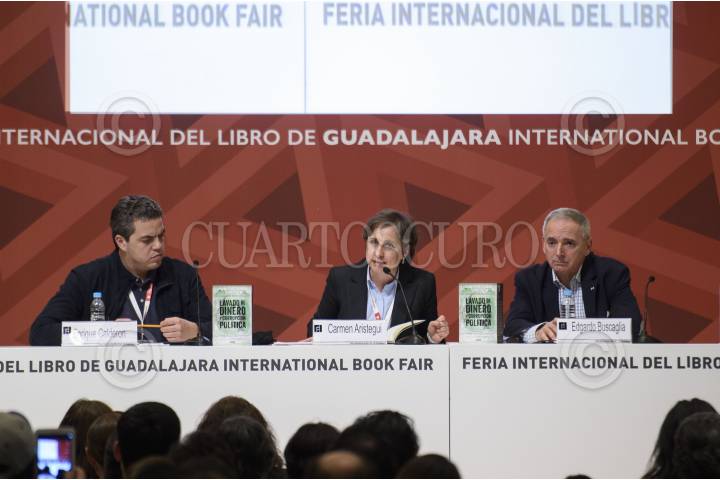 GUADALAJARA, JALISCO., 05DICIEMBRE2015.- Carmen Aristegui, y Lidia Cacho presentaron el Libro del escritor Edgardo Buscaglia “Lavado de Dinero y Corrupción Politica”, esto en el marco de la edición 29 de la Feria Internacional del Libro de Guadalajara FIL, que tiene como país invitado de honor al Reino Unido. FOTO: CUARTOSCURO.COM