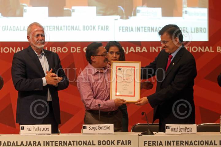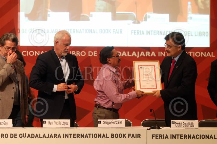 GUADALAJARA, JALISCO., 06DICIEMBRE2015.- Sergio González Rodríguez fue reconocido con el Homenaje Nacional de Periodismo Cultural Fernando Benítez, esto en el marco de la edición 29 de la Feria Internacional del Libro de Guadalajara FIL, que tiene como país invitado de honor al Reino Unido. FOTO: FERNANDO CARRANZA GARCIA / CUARTOSCURO.COM