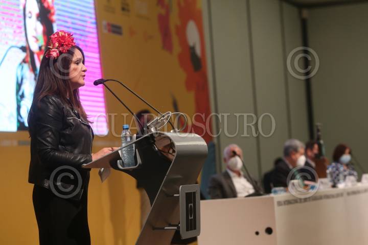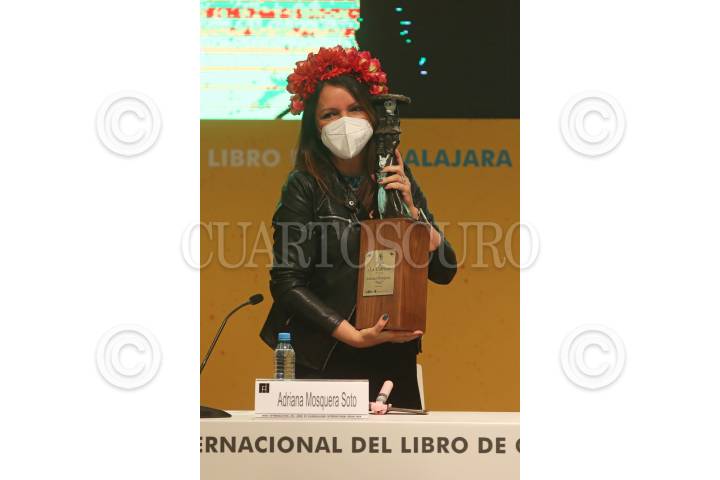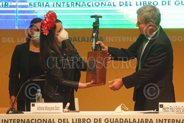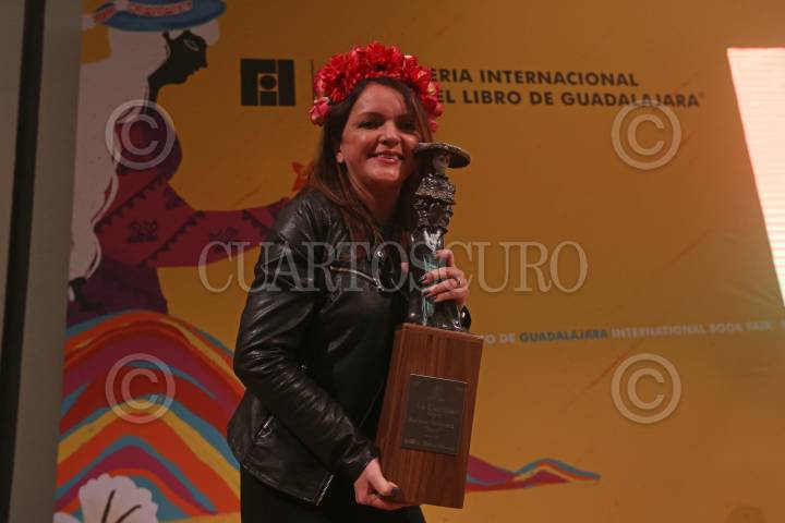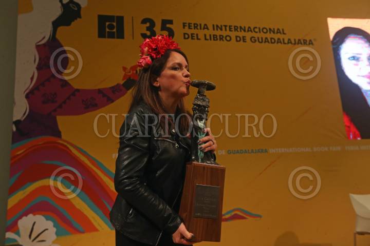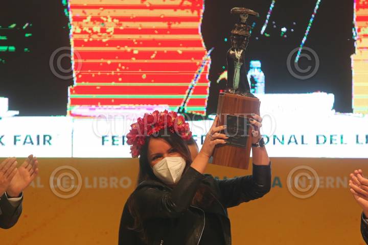 Adriana Mosquera Soto, caricaturista Colombiana, durante su discurso después de recibir el reconocimiento Homenaje La Catrina, en el marco de la edición 35 de la FIL.