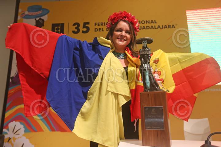 Adriana Mosquera Soto, caricaturista Colombiana, posa para con el reconocimiento Homenaje La Catrina, en el marco de la edición 35 de la FIL.