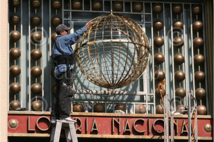 MÉXICO D.F., 02FEBRERO2008.- Un trabajador de limpieza del edificio de la Loteria Nacional lustrar la gran esfera que adorna la fachada del inmueble, la cual hase alucion a la gran tombola que alberga los miles de numeros que seran sorteados en sorteo, FOTO:RICARDO CASTELAN/CUARTOSCURO.COM