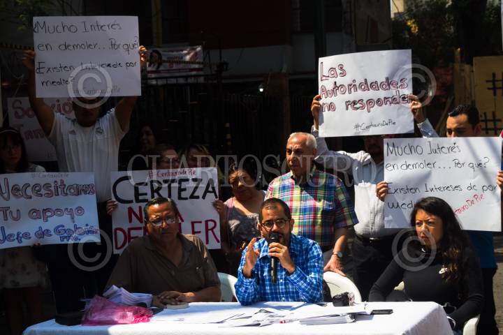 CIUDAD DE MÉXICO, 20MAYO2018.- Vecinos del edificio Centauro, ubicado en la colonia Doctores, ofrecieron una conferencia de prensa para dar a conocer que ellos han consultado con expertos estructuralistas sobre el daño que sufrió su edificación, mismos que les han dicho que es factible la reparación de su hogar, por lo que se oponen a la demolición, ellos comentan que tienen las pruebas de que su torre se puede reparar sin necesidad de someterse a un proceso de demolición y reconstrucción, situación que a decir de ellos tarda demasiado tiempo y cuyos trámites no son claros por parte del gobierno de la Ciudad de México. FOTO: MOISÉS PABLO /CUARTOSCURO.COM