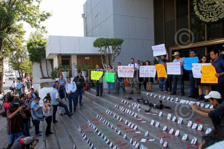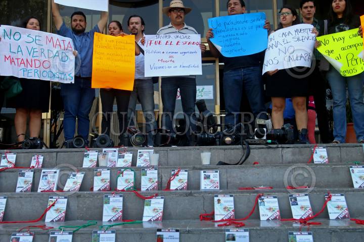 CUERNAVACA, MORELOS, 16MAYO2017.- Periodistas, reporteros, camarógrafos y fotógrafos de prensa se unieron a la protesta nacional por el asesinato del periodista y escritor Javier Valdéz, corresponsal de la Jornada y editor del semanario Riodoce de Sinaloa. En la ofrenda a las víctimas, en el zócalo de la ciudad, los trabajadores de los medios de comunicación exigieron a las autoridades federales que atiendan las agresiones en contra del gremio en el estado. En este año seis comunicadores han sido asesinados y van 37 en el presente sexenio. FOTO: MARGARITO PÉREZ RETANA /CUARTOSCURO.COM